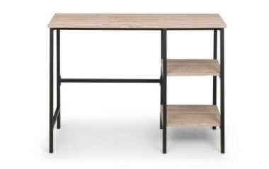 A cool, modern desk designed to add a contemporary touch to any living space. Its simple clean lines, delineated by a subtle, black coated metal frame are complemented perfectly by a beautiful walnut to create a very stylish and sleek product. This desk features 2 shelves on the right hand side,