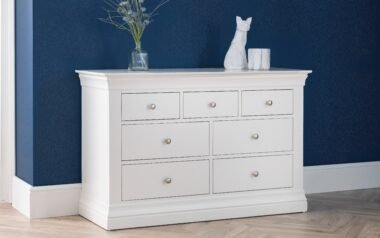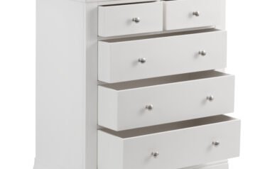 Taking its inspiration from classic French furniture, this sturdy looking chest of drawers from our Clair range has been finished in a bedroom brightening white lacquered finish. Styled with a chunky plinth and shaped top, it’s detailed with shiny brushed steel knob handles. Two shallow top drawers are ideal for
