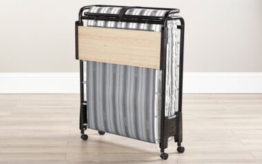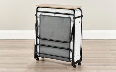 Suitable for regular use. Patent pending folding mechanism for optimum space saving. 360° castors for easy manoeuvrability. 100% Foam Free breathable Rebound e-Fibre mattress. Free from harmful chemicals & VOC’s. Hypoallergenic. J-Tex sprung base system for durability, support and comfort. Dimensions: Open: W77 x L200 x H29cm Folded: W77 x