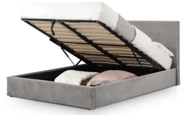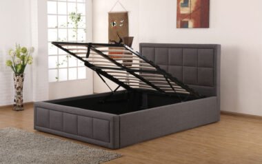 Slatted base Front-opening ottoman storage Dimensions: W162 x L221 x H111cm Storage Depth: 28Cms Mattress Not Included Gas Powered Lift-up Ottoman Offers Phenomenal Storage Sprung Slatted Base for Extra Comfort and Prolonged Mattress Life The Cherry Lift-up Storage Bed has modern, clean lines and is beautifully upholstered in a crisp