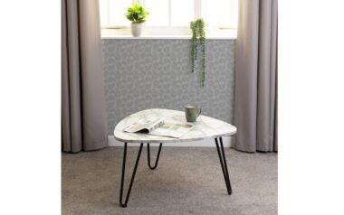 Marble effect top with metal pin-styled legs. W78cm x D78cm x H46cm You can choose your delivery date and time slot at check out.