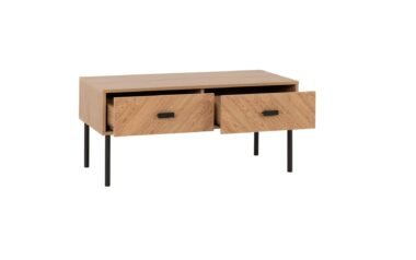 Stylish blend of timeless design and practicality Chic herringbone oak pattern on the door front Medium oak effect finish Part of the Linear collection 2 drawers for ample storage Versatile solution for organizing and displaying items Dimensions: W100 x D50 x H46 cm