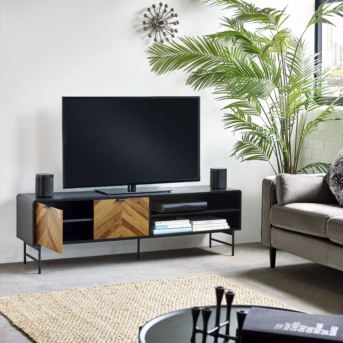 - Create a sleek and functional focal point in your living room with this TV unit. Featuring bold chevron warm wood-effect doors framed by smooth curved edges and finished with sleek black edge handles, it offers subtle style and refined detail. Two open shelves provide easy access for media devices or decorative items, while two doors open to reveal shelves inside, offering generous hidden storage. Designed to fit TVs up to 65 inches, it’s supported by slim black metal legs for a lightweight feel with an industrial edge.