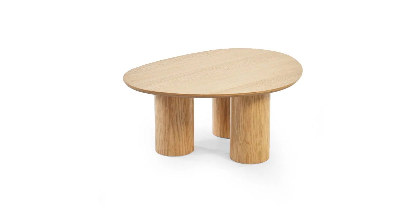 - Bring sculptural elegance and modern calm into your home with this statement coffee table. Its asymmetrical tabletop design breaks away from traditional shapes, creating a striking focal point while still offering plenty of usable surface space. Balanced on three cylindrical legs and beautifully finished in a warm oak effect, it blends artistry with everyday function. Perfect for Scandinavian-inspired interiors, its sleek minimalism shines when styled with books or ceramics for a curated touch. Ideal for both daily living and weekend hosting.