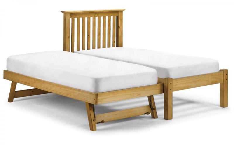 - An imposing bed frame made from solid pine in a timeless shaker style that sits equally well alongside contemporary and traditional interiors. Substantial posts and capping combine with a solid pine slatted base to ensure an incredibly robust and durable bed frame. The pull out guest bed can be raised up to the same level as the main bed frame to offer fantastic functionality.