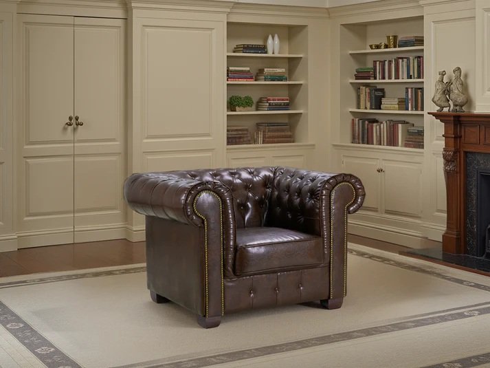 - The famous, timeless design that never goes out of fashion! With a choice of a stunning Oxblood Red or an Antique Brown, bonded leather upholstery and renowned button studded cushioning, The Chesterfield is a great choice for any interior.