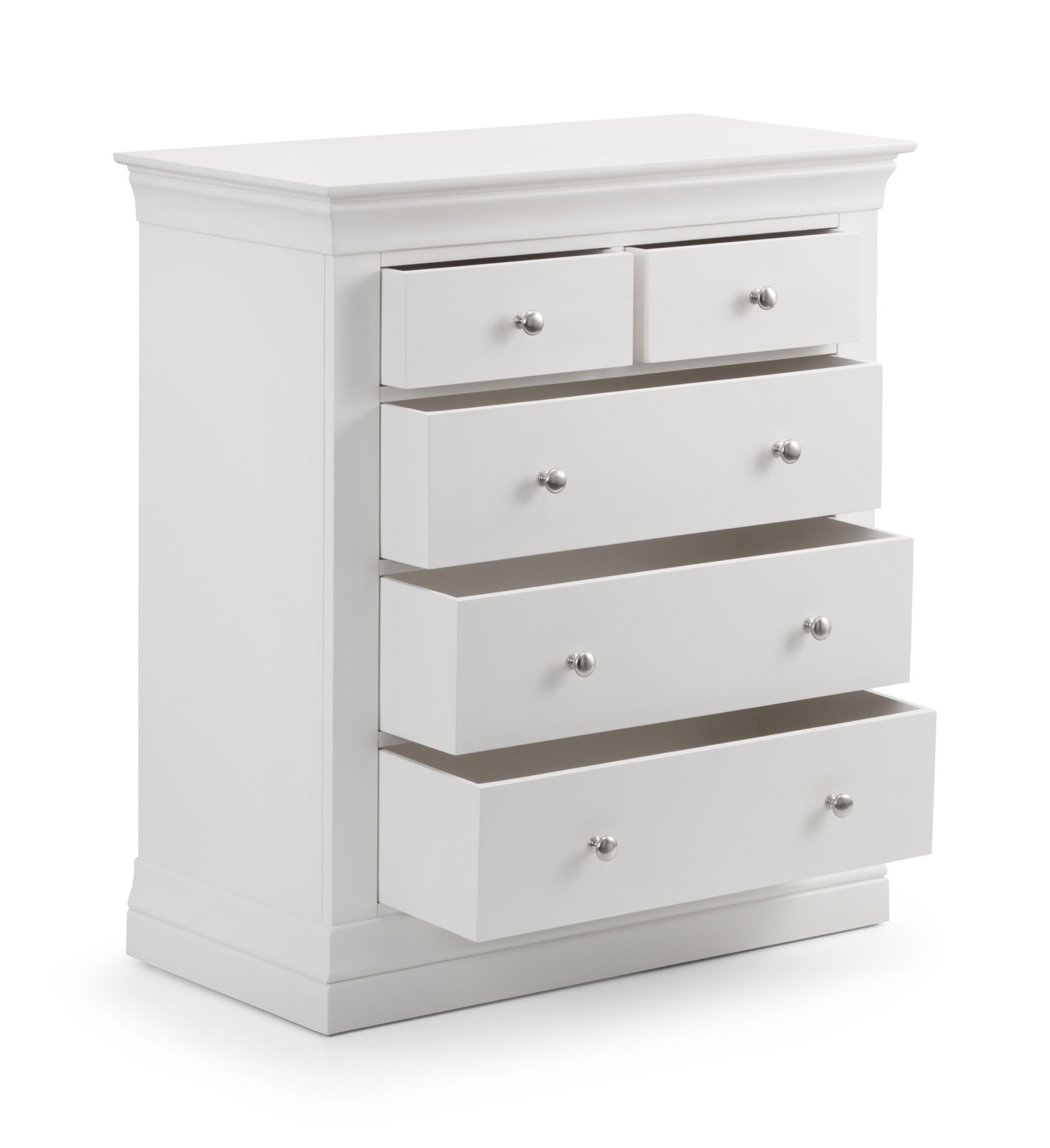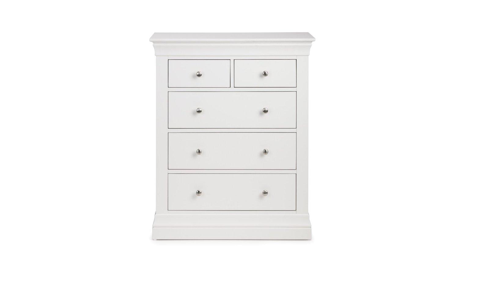 - Taking its inspiration from classic French furniture, this sturdy looking chest of drawers from our Clair range has been finished in a bedroom brightening white lacquered finish. Styled with a chunky plinth and shaped top, it’s detailed with shiny brushed steel knob handles. Two shallow top drawers are ideal for socks and underwear, while the three deep drawers allow you to stow away thicker items, like jumpers and