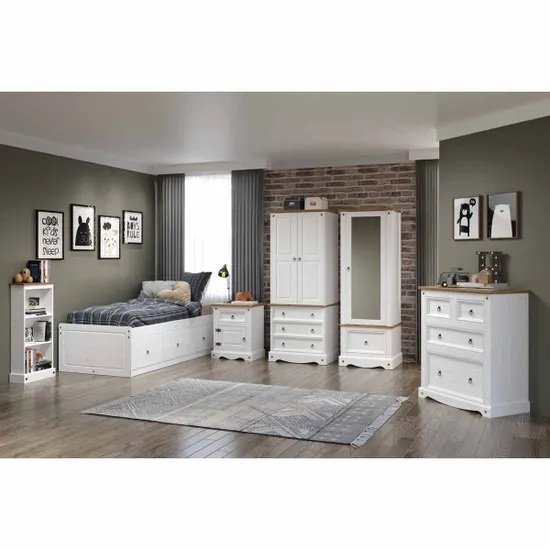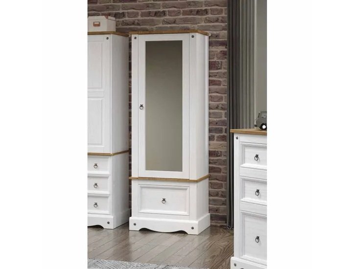 - Features a 1 drawer, 1 door design that is manufactured from Solid Pine in a white wash effect and also completed with a beautiful white washed wax finish, internal hanging and mirrored door. This Armoire offers a medium storage solution for your home and is manufactured to suit any setting whilst combining strength with reliability.