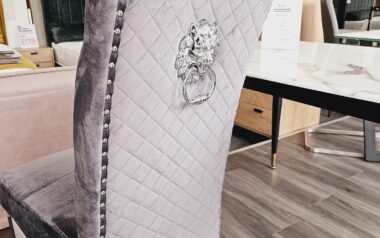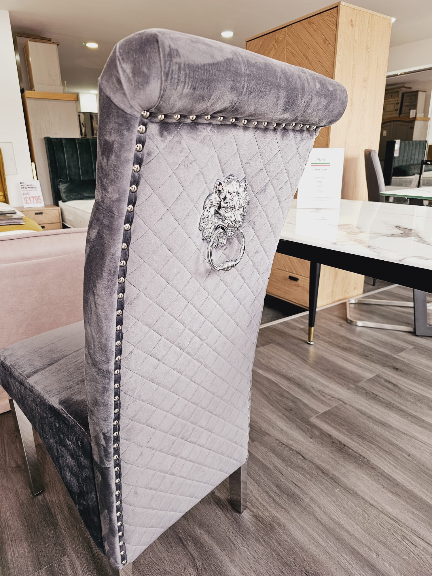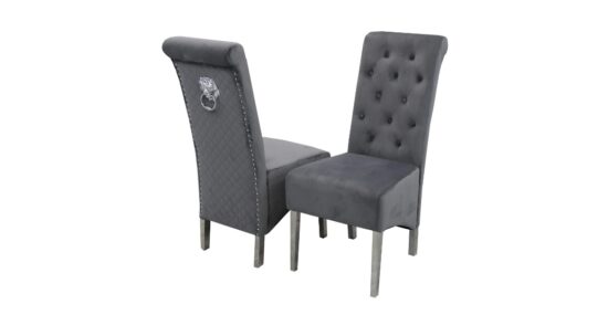 • Incredibly stylish, boasting contemporary design, the Gemma Dark Grey Velvet Dining Chair comes in a sumptuous velvet finish in a dark grey colourway with a scrolled top, button back design and quilted back with a chrome finished lion knocker.