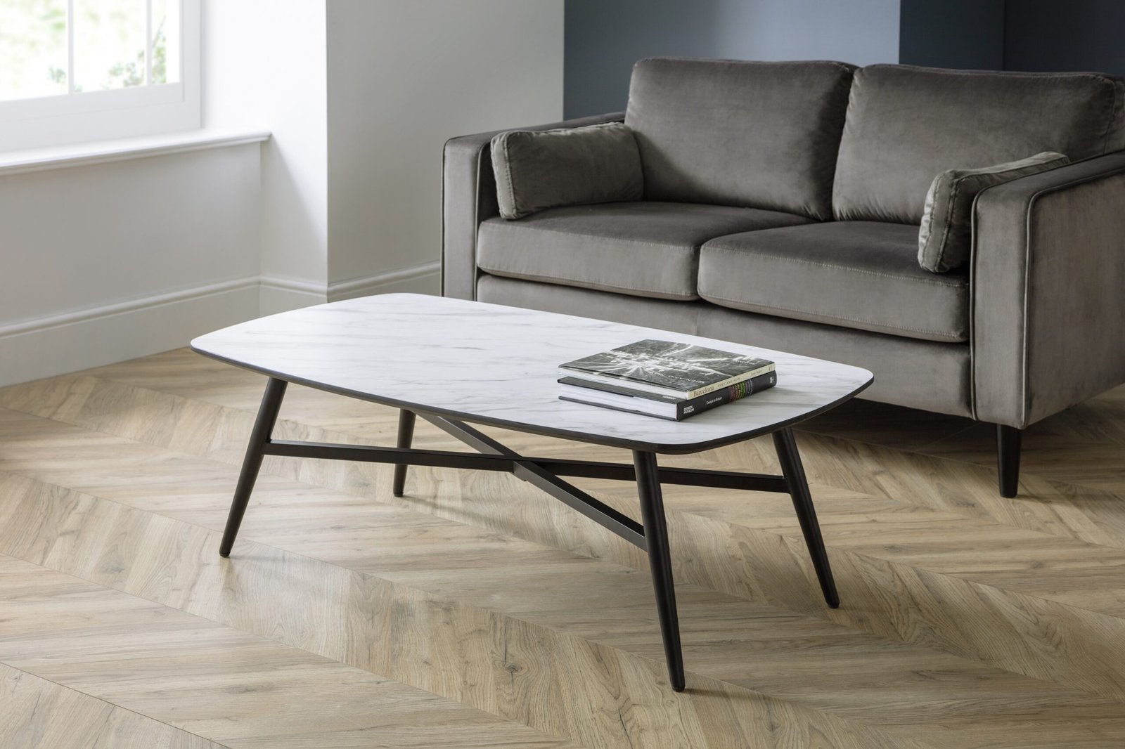 - A large rectangular shape to gather around, this luxurious coffee table will become the focal point of your living room. Crafted from MDF with a stunning white marble finish and black powder coated steel legs, the Karo coffee table if perfect for a wide range of modern décor.