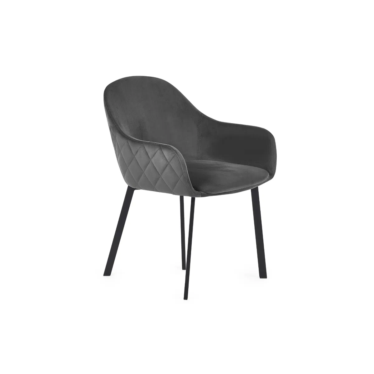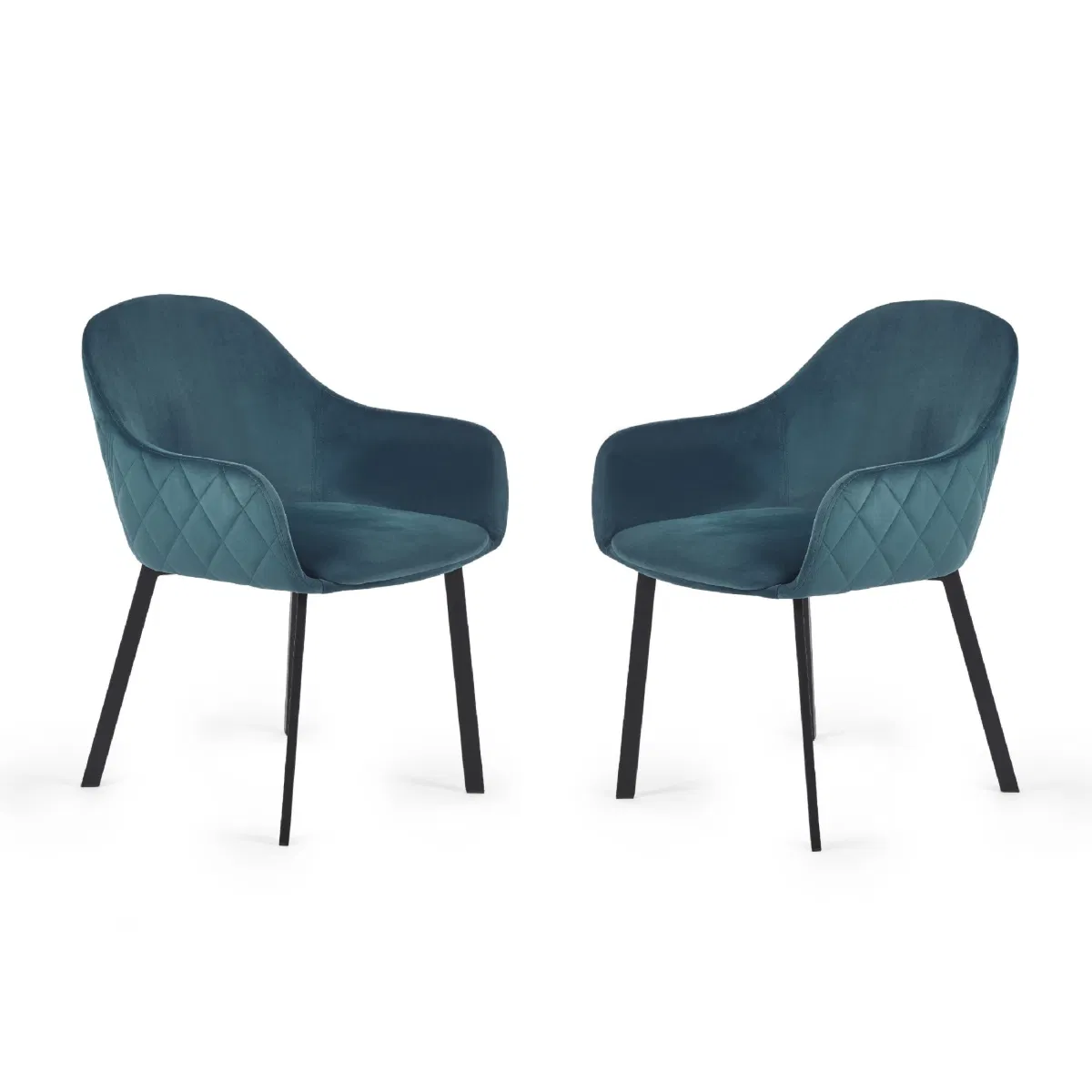 • Lima dining chair upholstered in teal or grey plush velvet fabric with subtle diamond stitching on the backrest, adding modern texture and style to your dining space.