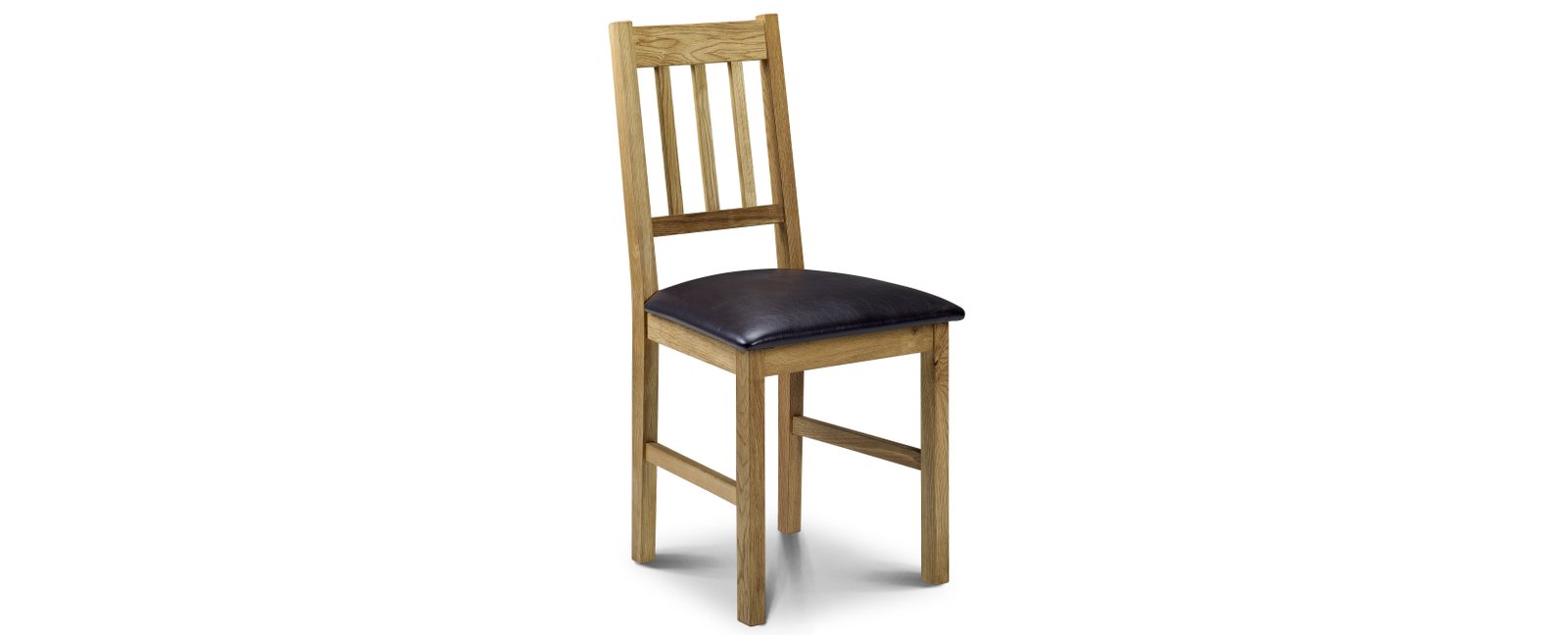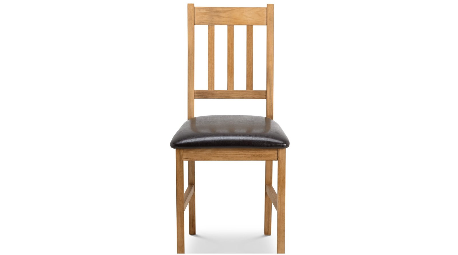 Solid White Oak Dining Chairs in a durable oiled finish and featuring a padded brown faux leather seat.