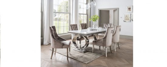 - The Selena dining collection is opulent and inspiring thanks to its bone white marble to and swooping stainless steel legs.