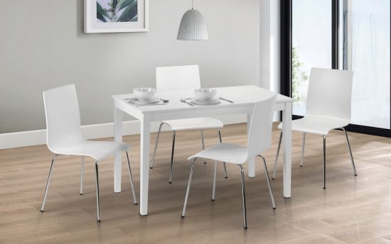 - The Tokyo Dining Set is the perfect solution for any modern dining room. Constructed from laquered MDF and rubberwood in a white finish, makes this ultra-modern dining set contemporary as well as versatile.This dining set consists of the Tokyo dining table and four Mandie chairs, creating a clean, crisp look.