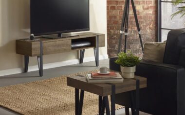 • Bring character and style to any corner of your home with this lamp table. Its compact surface is perfect for a lamp, drinks, or your favourite decorative accents, making it a versatile addition to any living space. The rustic wood effect finish showcases natural wood grain and unique imperfections, giving each piece its own personality. With sleek matt black hairpin legs, it effortlessly combines industrial charm with a modern edge.