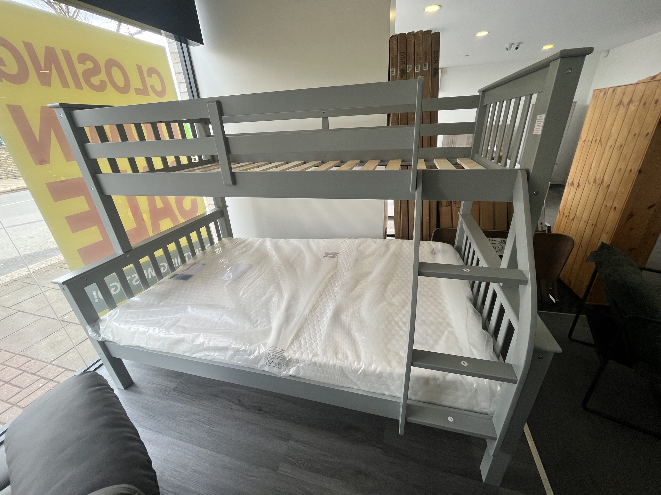 - The Triple bunk bed available in a grey painted finish hosts a space-saving kids’ sleeper that accommodates three sleepers comfortably.
