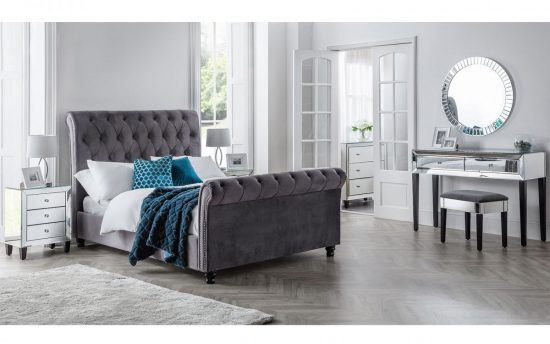 - Oozing elegance, the Valentine bed is sure to be a luxurious focal point in any bedroom. This beautifully crafted bed offers a sophisticated sleigh design, upholstered in a soft velvet fabric with classic button detailing and stylish studding. Available in Double, King, and Super King sizes.