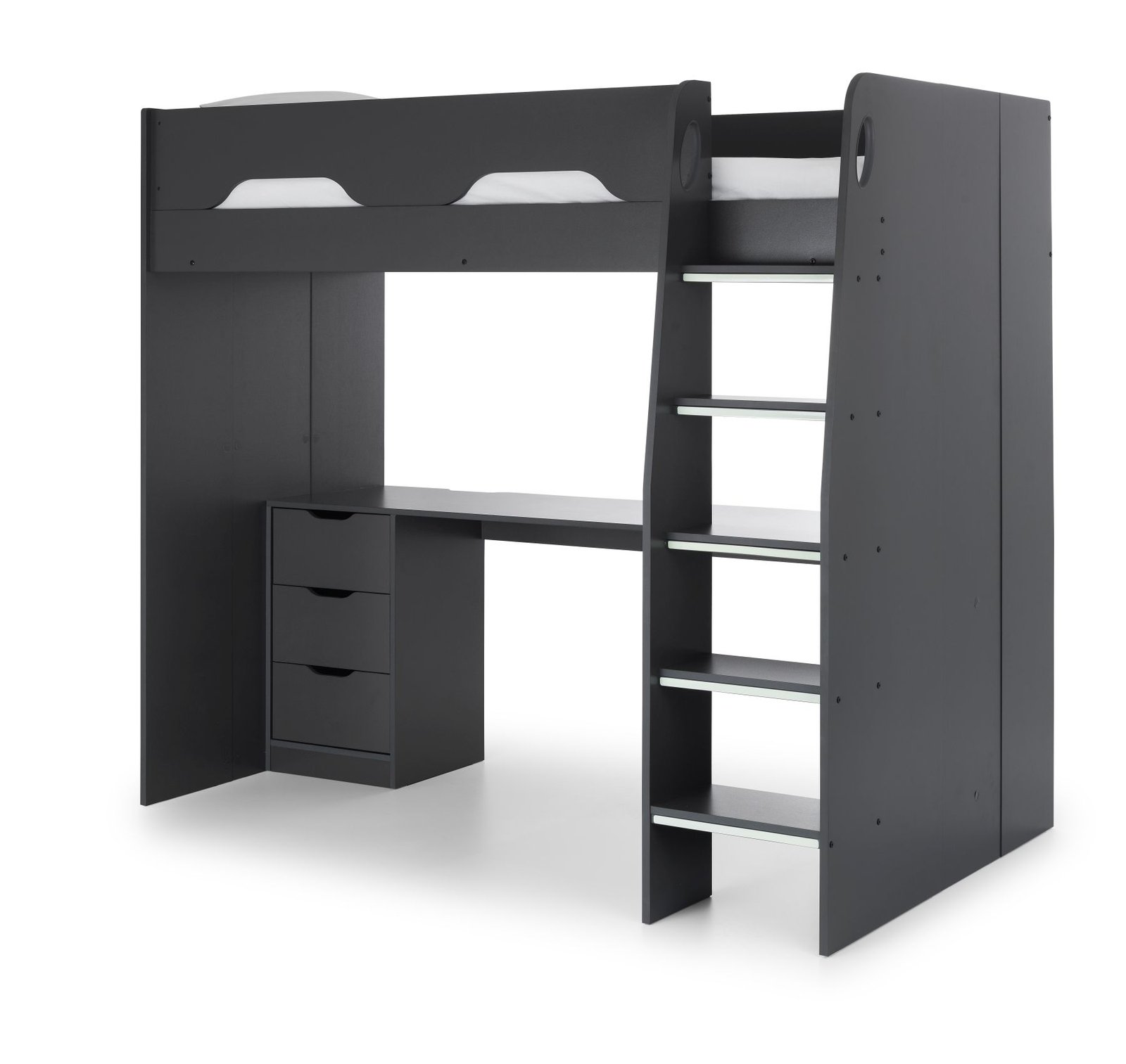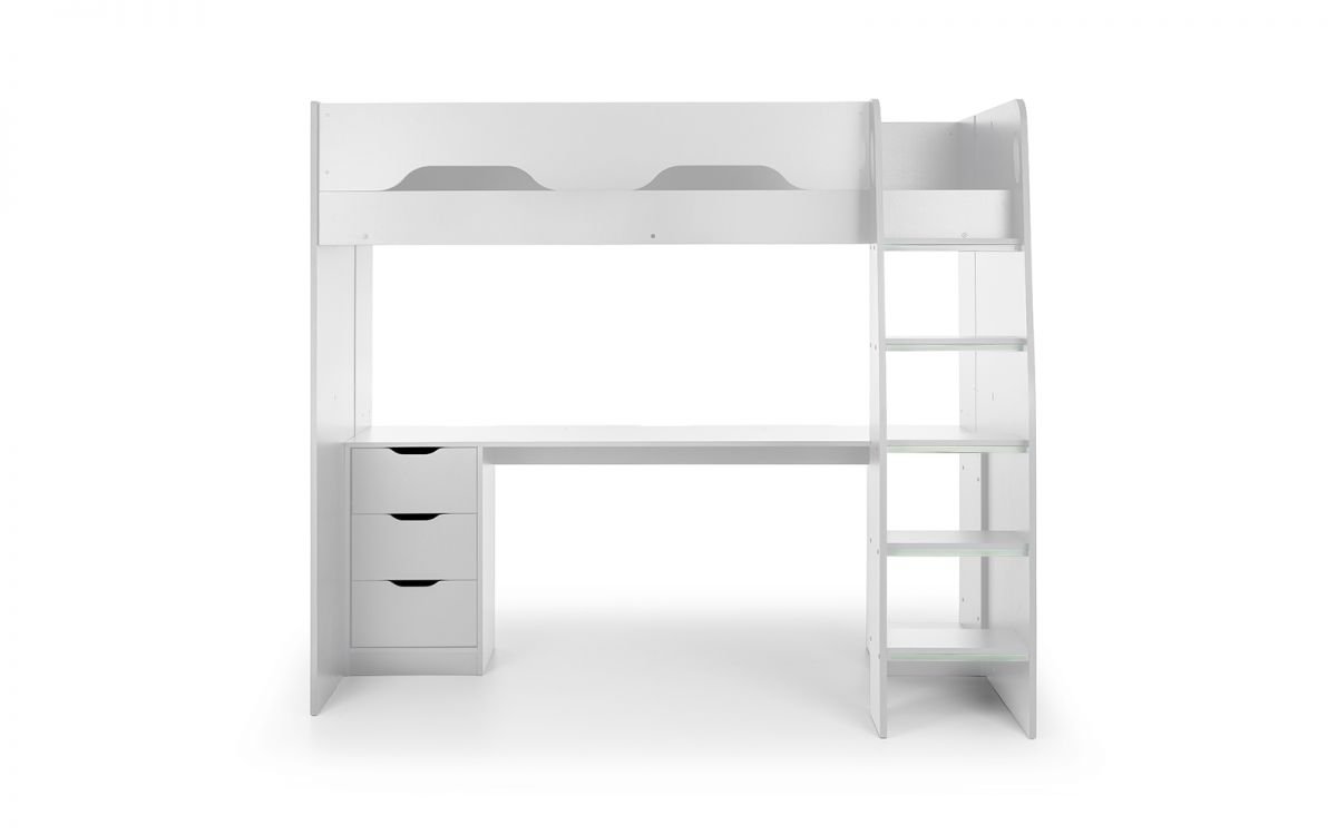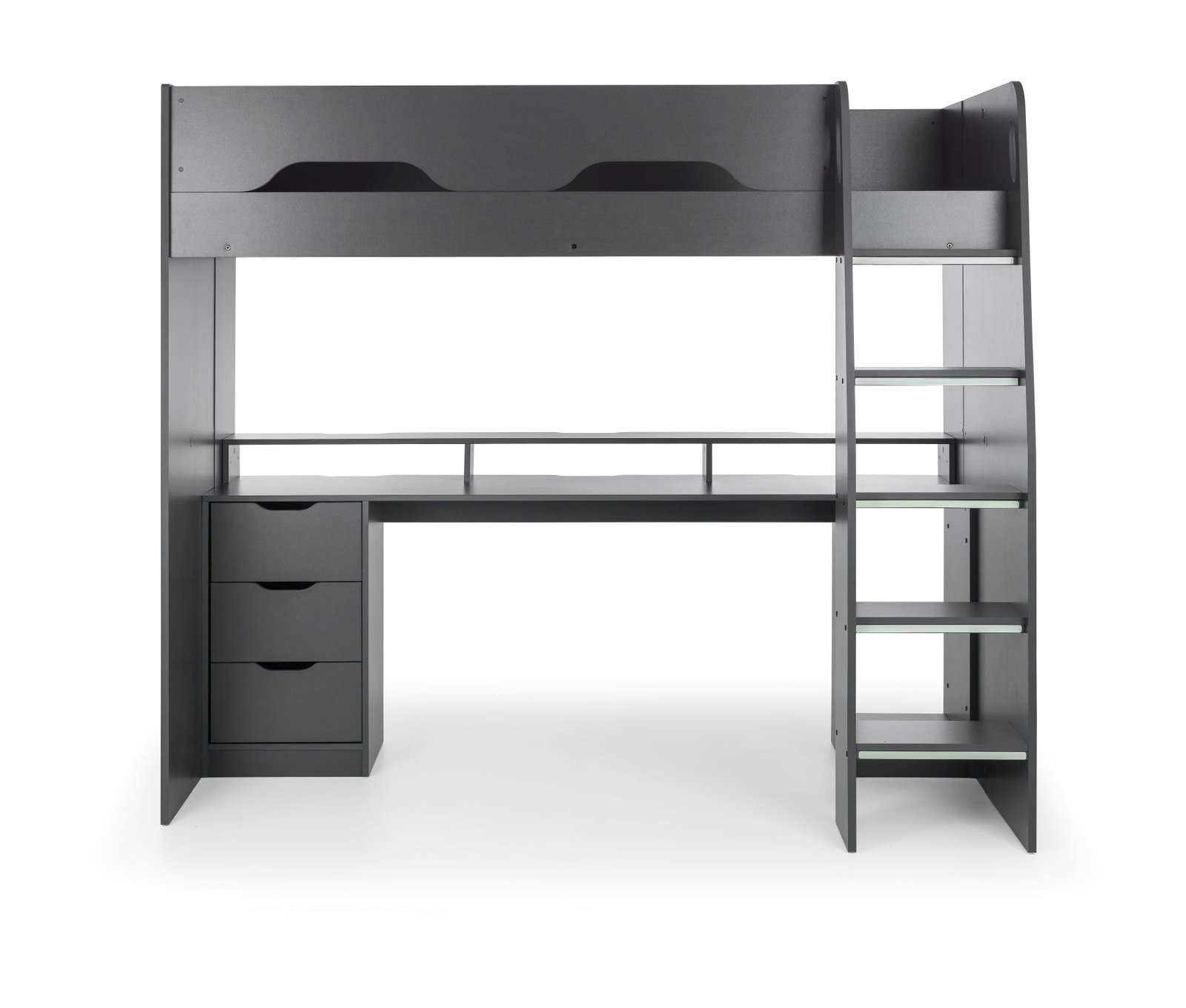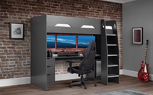 - Large desk accommodates three monitors, with removable shelf for bigger screens